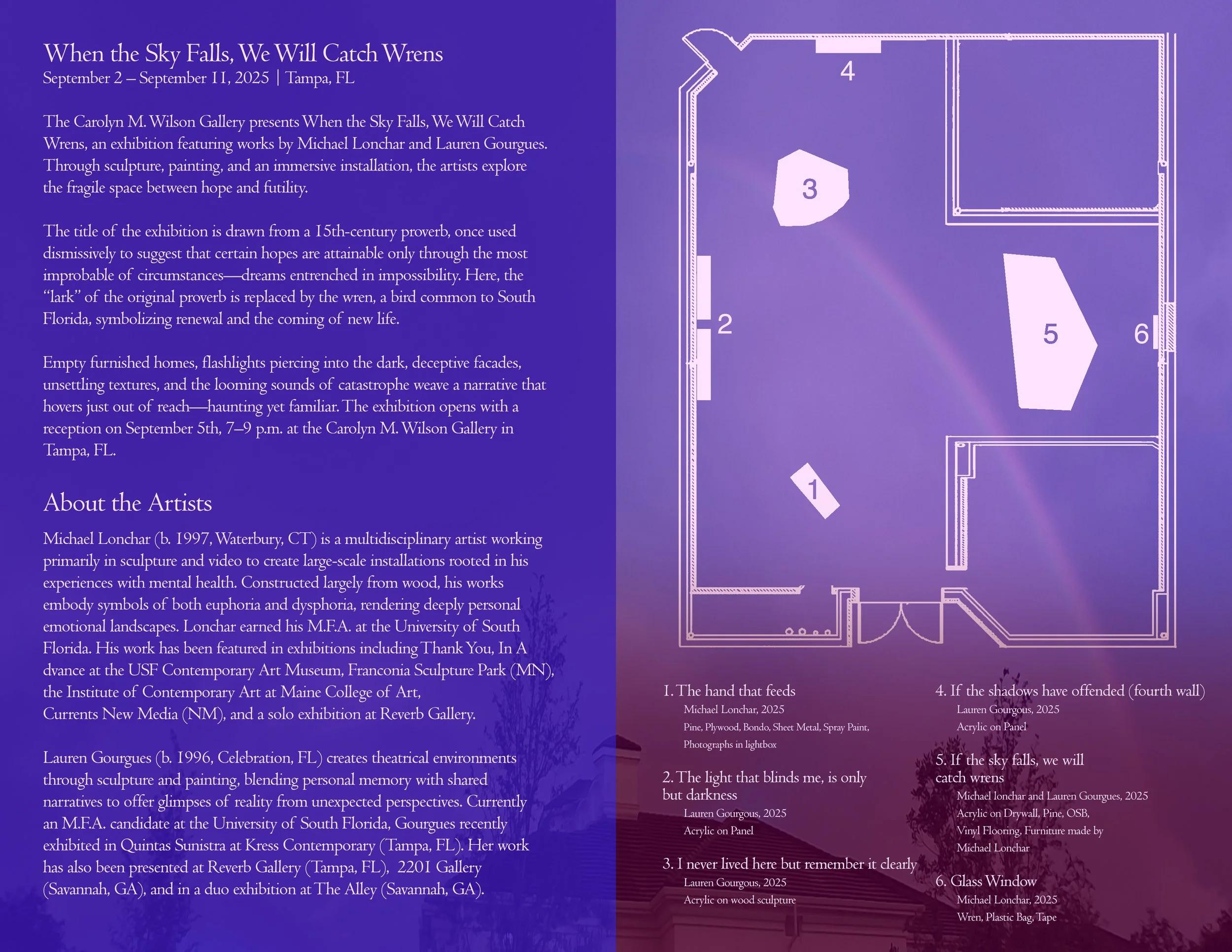 The title of the exhibition is drawn from a 15th-century proverb, once used dismissively to suggest that certain hopes are attainable only through the most improbable of circumstances—dreams entrenched in impossibility. Here, the “lark” of the original proverb is replaced by the wren, a bird common to South Florida, symbolizing renewal and the coming of new life.